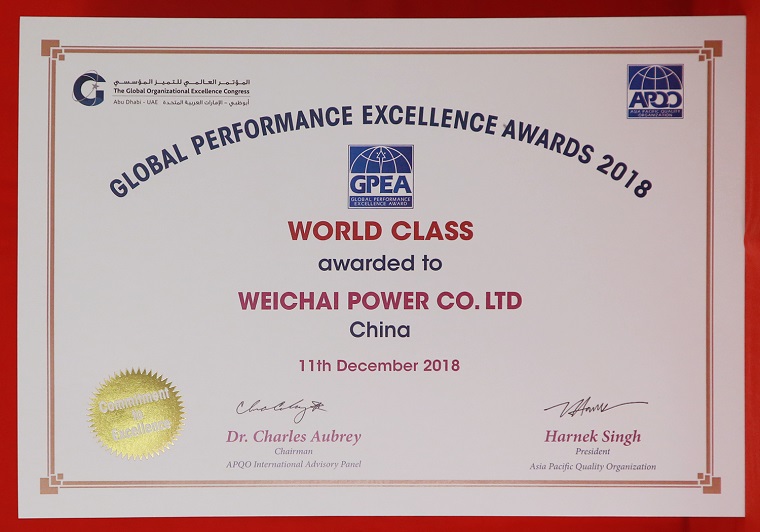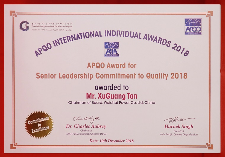 日前,第24届亚太质量组织国际大会在阿联酋首都阿布扎比举行。会上,谭旭光荣膺“2018亚太质量奖个人奖—卓越诚信企业领袖”,潍柴动力荣获“2018全球卓越绩效奖——世界级”。