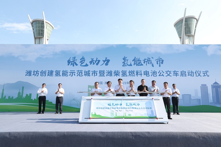 23日下午,潍坊市人民广场上,搭载潍柴氢燃料电池的中通公交车整齐列队、蓄势待发。“绿色动力 氢能城市”潍坊氢能示范城市创建暨潍柴氢燃料电池公交车正式运营仪式在这里隆重举行。