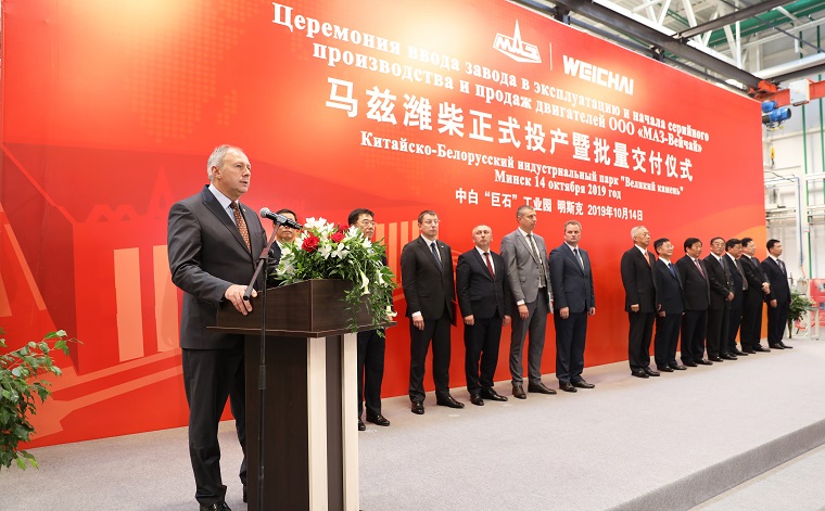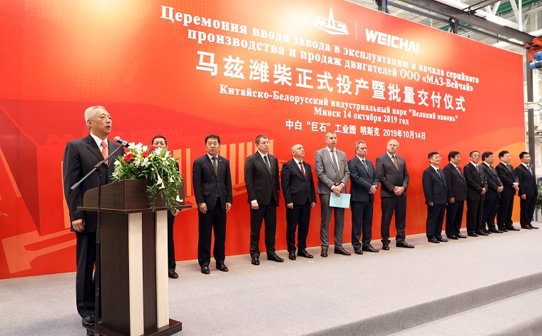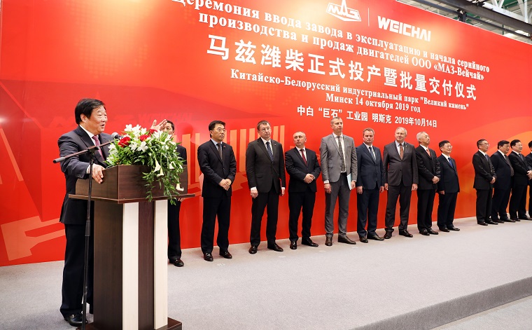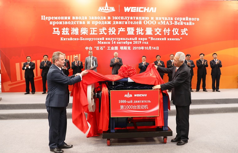 马兹潍柴公司第1000台下线发动机揭幕中国驻白俄罗斯特命全权大使崔启明、白俄罗斯政府多位部长和山东省政府代表团参加活动。