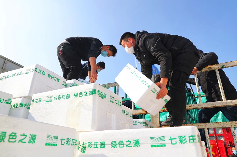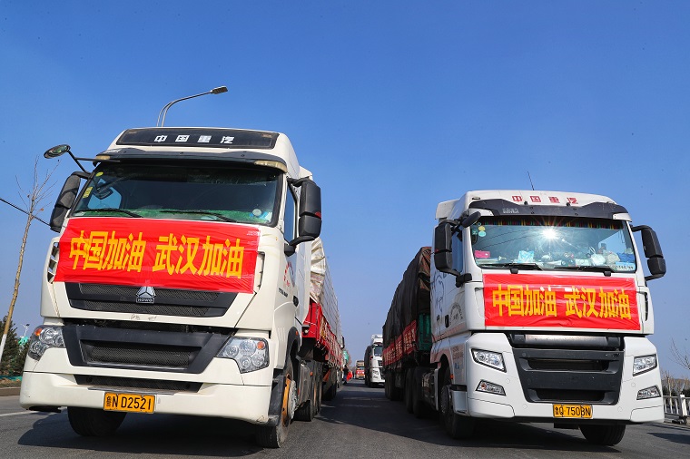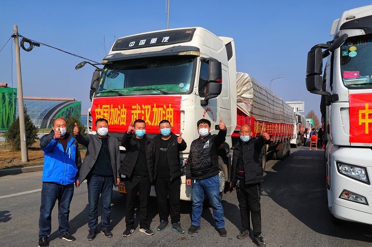 2月3日下午1点,在山东潍坊308国道与羊田路交叉路口,10辆中国重汽汕德卡、豪沃整装待发,车上满载潍柴动力捐赠武汉疫区的首批200多吨新鲜优质蔬菜。