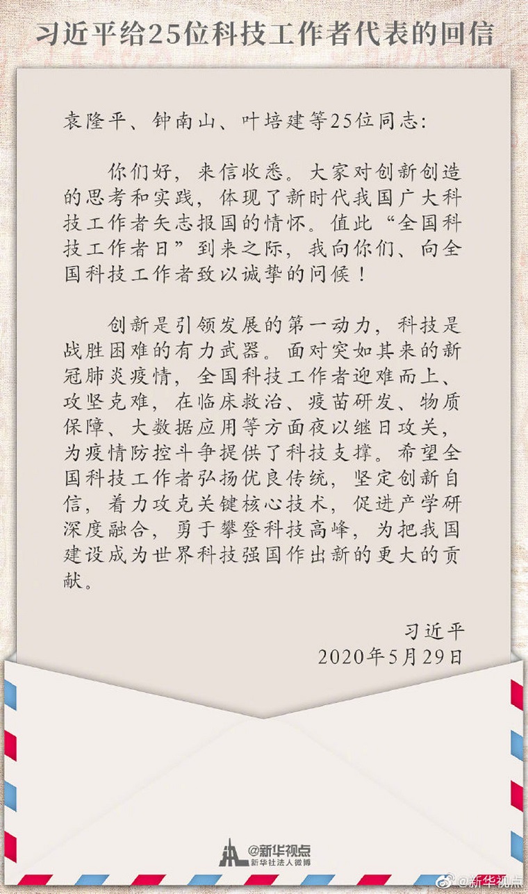 5月29日,在第四个“全国科技工作者日”到来之际,谭旭光等25位科技工作者代表收到了习近平总书记的回信。