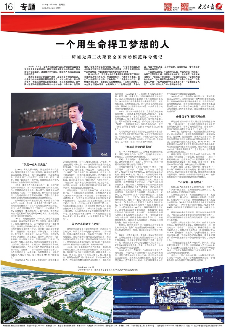 谭旭光常说,“潍坊人民养育了我,山东人民成就了我。”他有浓厚的家国情怀,培育带动产业链几百家国内外企业落户齐鲁大地。今年新冠肺炎疫情暴发以来,他义无反顾地担起疫情防控和复工复产的重大责任,从正月初三山东省4万名员工上岗复工复产,到2月12日打响全省重大项目开工第一枪,再到11月19日山东重工(济南莱芜)绿色智造产业城智能网联重卡项目投产,今年以来企业收入逆势同比增长25%,为山东经济高质量发展起到重要的带头作用。谭旭光的表率效应影响了一大批制造业企业和企业家。很多人都说,山东需要更多的“谭旭光”。